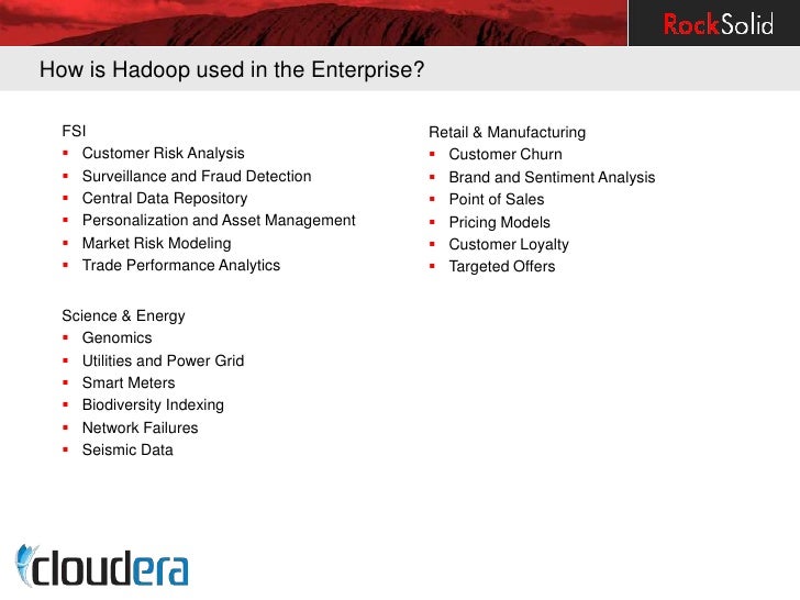 What is Hadoop? The webinar will • A datanode is a server in the Hadoop cluster where actual processing takes place –i.e. where your programs are run. • Or use the big data tools to transform and reduce the size of your data –if this is a viable option, ... Access Content