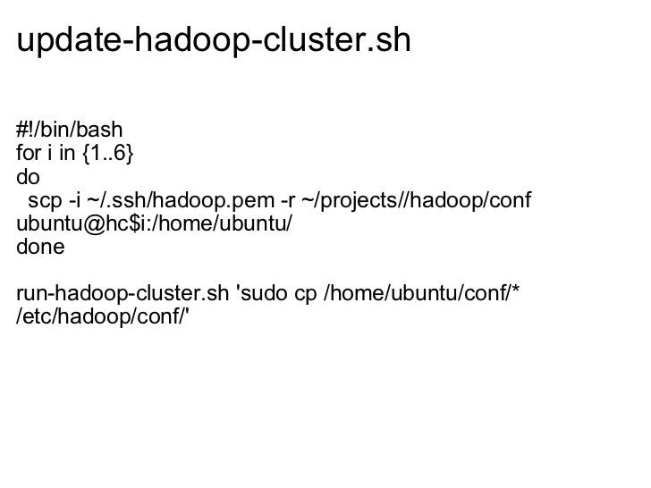 Pair, and it will be shared across the cluster. Hadoop requires SSH access to manage its nodes, i.e. remote machines plus your local machine. $HADOOP_HOME/bin Configuration hadoop-env.sh Change the file: conf/hadoop-env.sh #export JAVA_HOME=/usr/lib/j2sdk1.5-sun ... Return Doc